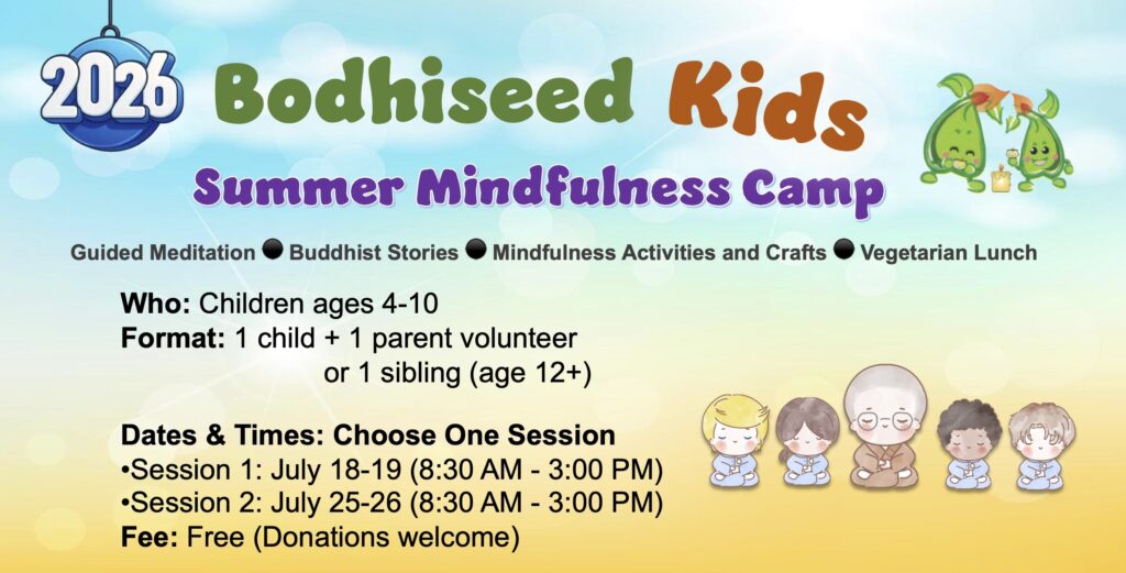 Bodhi Seed Class is for children of age 5 to 10 years old. This class is designed to help students discover their inner wisdom and develop their potential, positive and moral outlook on life through meditation and Chan stories. The creatively designed curriculum consists of instructions on meditation techniques, Dharma talks, Buddhist/Chan stories, mind-developing activities, group discussions, and fun crafts.